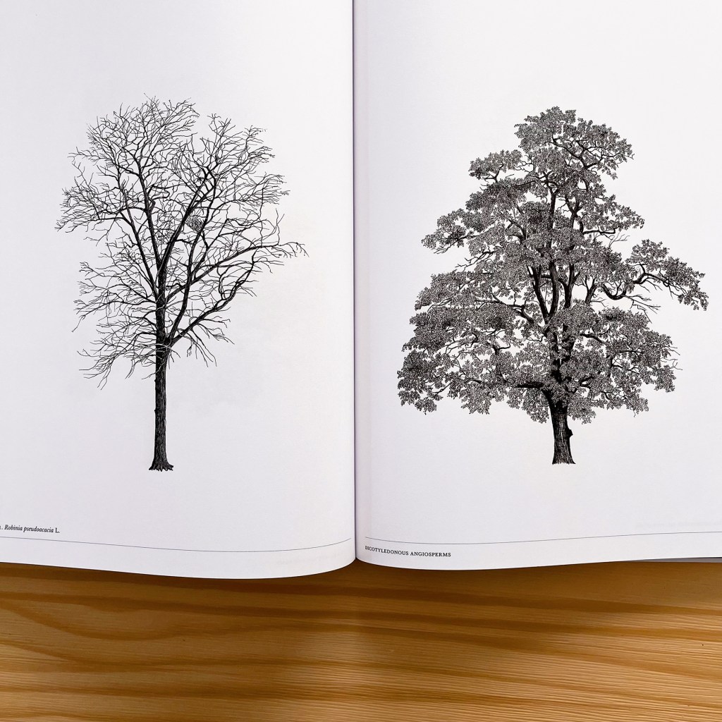 One of the biggest (literally) treasures in my small library — pictured above, hand for scale — this book is indescribably great. Created for landscape designers, it is chiefly an atlas of tree species, rendered in fine pen-and-ink drawings, with and without foliage, and in a scale proportional to each other and to the book itself. It contains a few intro/essays that I found utterly fascinating, despite not being a landscape designer (to my frequent chagrin), and pages of spirographs depicting shade patterns and of ink splots acting out seasonal coloration, along with plant-catalog-style descriptions of each of the trees depicted, plus glossary and index. It’s just incredible.