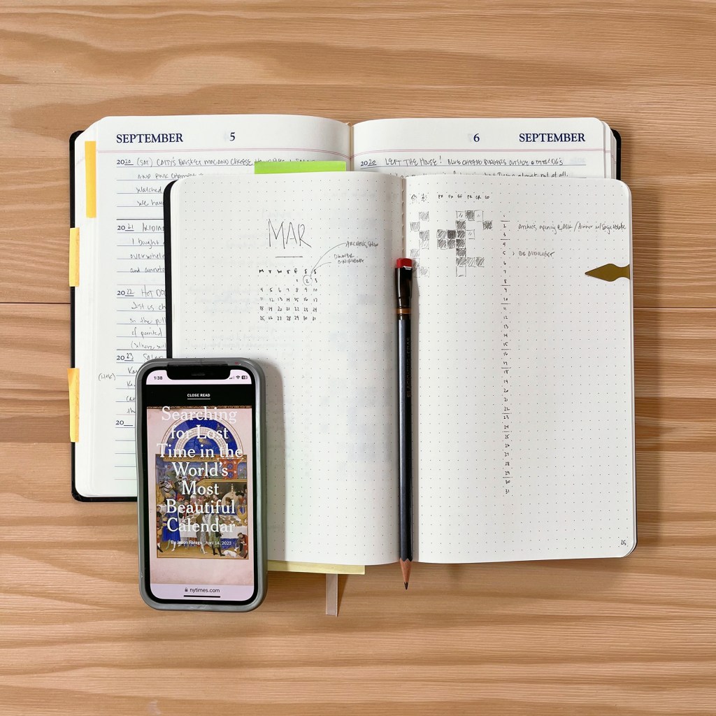 My second journal, kept simultaneously, was the version of a DIY datebook I’ve developed for myself over years and iterations. In late 2020, I settled on the form I’ve been using ever since. People familiar with the bullet journaling community would call it a “bujo,” despite that the only thing it has in common with Ryder Carroll’s inspiring Bullet Journal method is the linear 1-31 date list — which, as the duke’s book shows us, is a tradition as old as calendar-making. I couldn’t help but feel an affinity with this handmade datebook from 1410, as extraordinarily different as it is from mine, and wonder what of its features I might be able to incorporate. Farago compares it to an almanac; mine does track the weather.