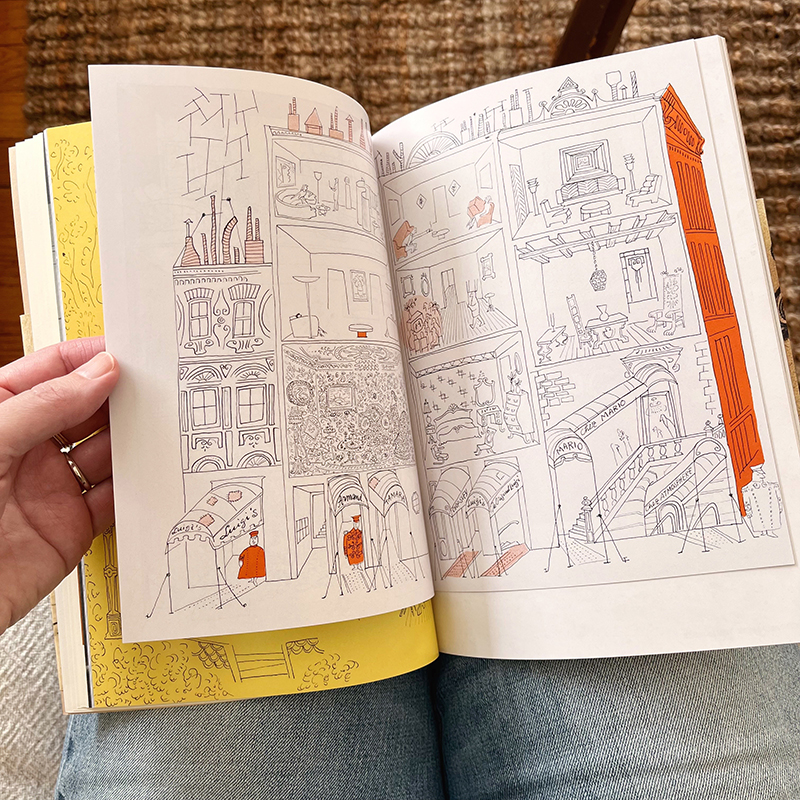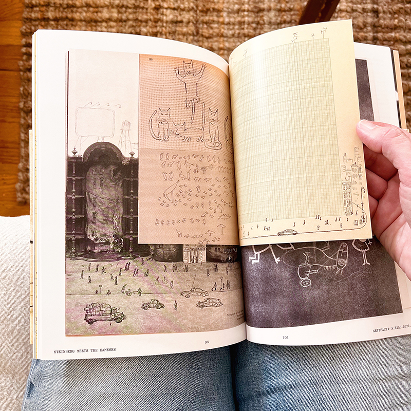 I was in college, studying graphic design and design history under a Cranbrook alum, circa 1990 just as Mid-Century Modern revivalism was at peak fervor. In other words, I was bathed in it both at school and in the home decor magazines I hoarded. But while MCM’s main manifestation — both originally and in the early ’90s — was the bright, spare, mid-century-only look, I’ve always favored the more layered and eclectic Ray Eames approach. You know, the undersung Ray!, wife of Charles Eames, who was his partner in life and design, and whose design style is on full display in their iconic Pacific Palisades home, aka Case Study House No. 8. Their life as a creative couple — and the ways in which that whole group collaborated and influenced each other — is the most interesting thing about them, to me. But I hadn’t known about their friendship and playful collaborations with illustrator Saul Steinberg (and his wife Hedda Sterne) until I ran across this fantastic, magazine-sized book, Steinberg Meets the Eameses*, in an email from one of my all-time favorite bookstores, William Stout Architectural Books in San Francisco.